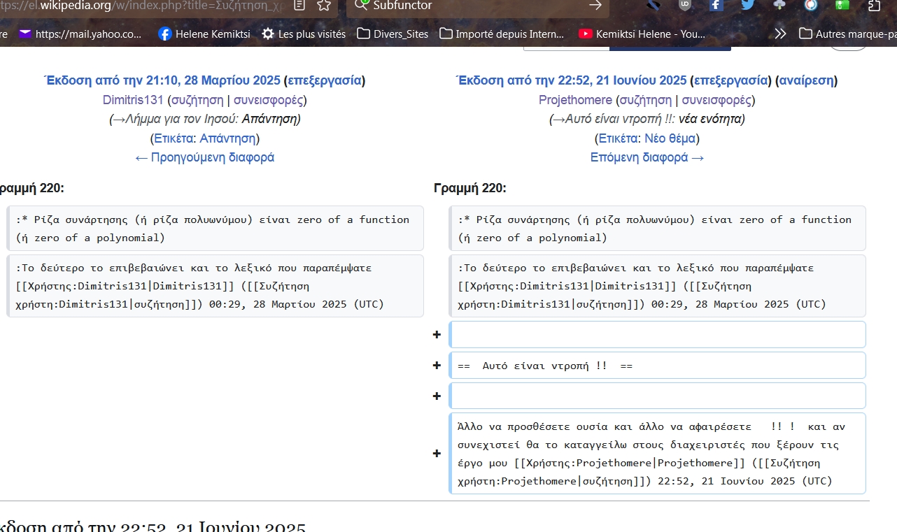 - Δεν διαφωνώ μαζί σας και μάλιστα κάθε φορά που εσείς ή ο Φώτης κάνατε κάποιες τροποποιήσεις ή διορθώσεις πάντα ευχαριστώ -Ο Dimitris131 δεν θέλει τροποποιήσεις των σελίδων που δημιούργησε, ανέφερα και το παράδειγμα του μικρού λήμματος που είχα προσθέσει υλικό χωρίς να αφαιρέσω τις εργασίες του και μετά μου είχε διαγράψει ένα σημαντικό μέρος από άλλο λήμμα που είχα δημιουργήσει δεν νομίζω ότι ήταν σωστό;;; - Δεν το είχα αναφέρει στους διαχειριστές διότι δεν θέλω να χάσω χρόνο με τέτοιες ιστορίες και όπως είπα με ενδιαφέρει περισσότερο να δημιουργώ νέα λήμματα. Επίσης αυτοί που κάνουν παρεμβάσεις κυρίως σε επιστημονικές σελίδες καλό είναι να γνωρίζουν καλά το αντικείμενο διότι αλλιώς χάνετε η αντικειμενικότητα. Να 'στε καλά!! Projethomere (συζήτηση) 19:53, 14 Οκτωβρίου 2025 (UTC)