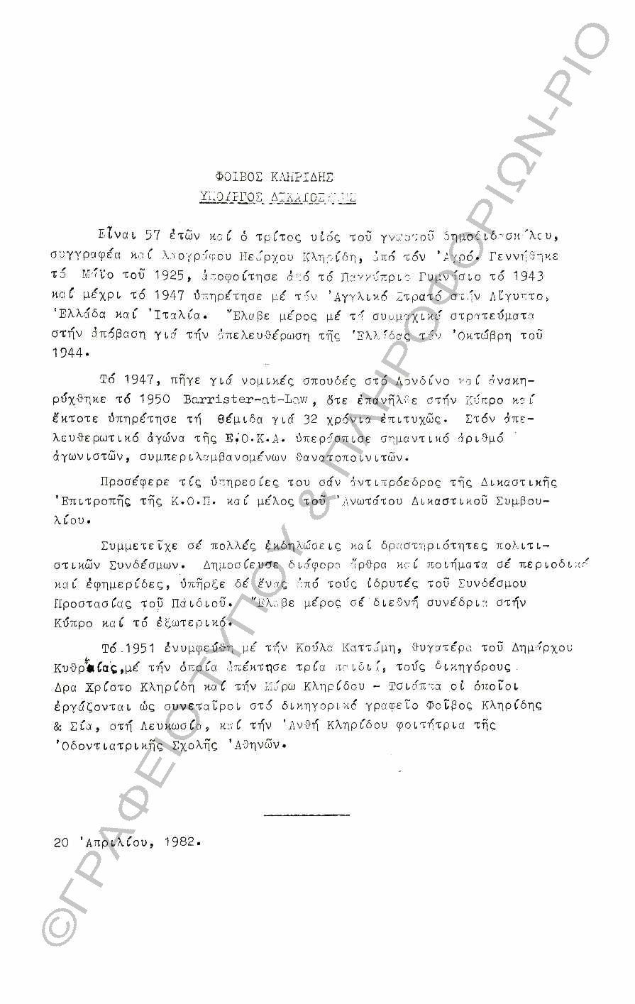 - «Φοίβος Κληρίδης». Γραφείο Τύπου και Πληροφοριών. 20 Απριλίου 1982. Αρχειοθετήθηκε από το πρωτότυπο στις 5 Απριλίου 2020. Ανακτήθηκε στις 5 Απριλίου 2020.
